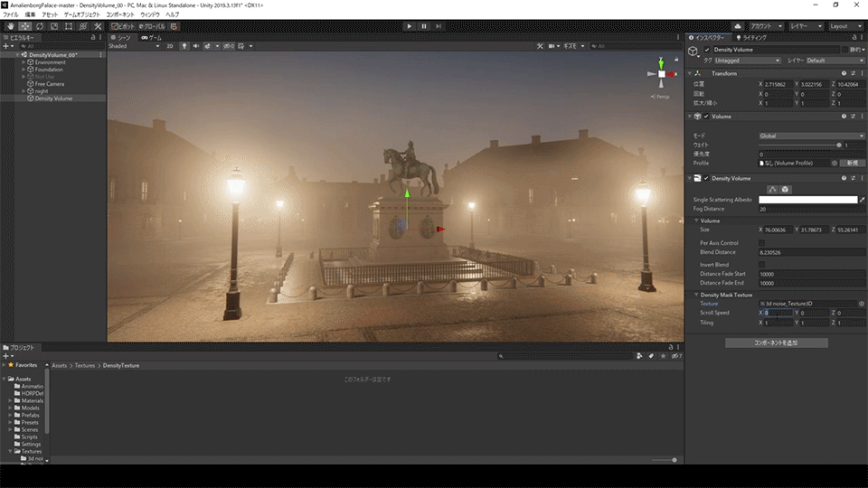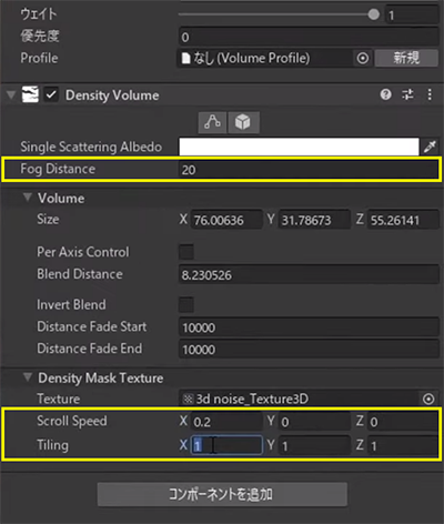 Density Volumeは、インスペクタから任意の3Dテクスチャを指定することで、霧の濃さに粗密をつける事もできます。