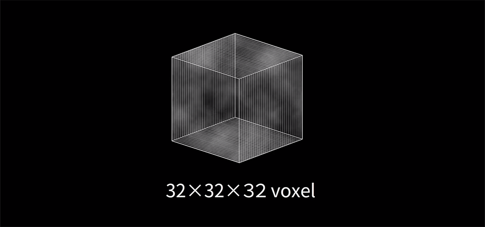 まず32×32×32ボクセルの3Dノイズを想像してください。これをZ方向に1ボクセルずつ輪切りにします。