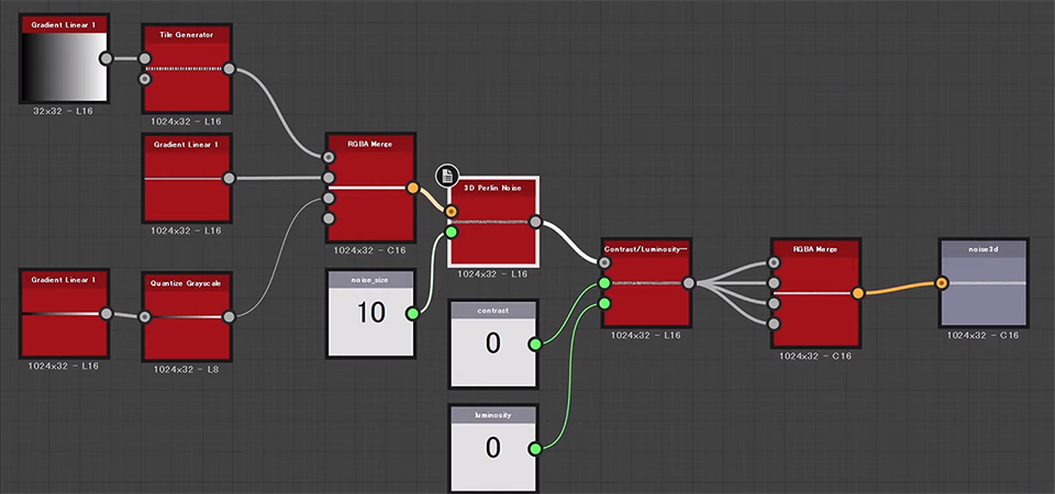 Substance Designerには始めから3Dノイズの概念があるので、これを上手く加工すれば少ない手順で求める2Dテクスチャが得られます。私も、ピクセルプロセッサーなどは使わずに、これだけのノードで作ることができました。